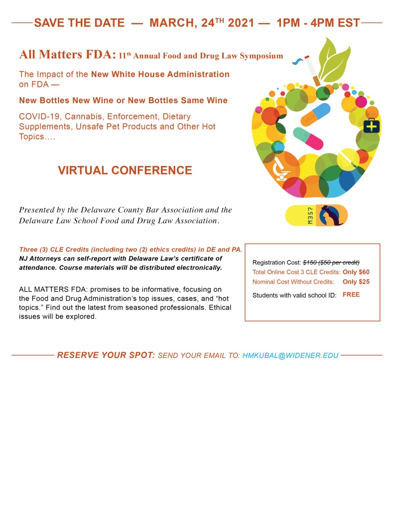 This week, on Wednesday October 21, from 1-4pm, the FDLA, Delaware Law will be virtually hosting its “All Matters FDA” Symposium which will host a variety of speakers from professors, to judges, to other professionals in the field to discuss a range of topics such as: opioids and pharmaceuticals, COVID-19, vaping, cannabis law, and pet products. Just follow the link below to register. Even if you can only attend in part we hope you will be able to join us! If you register and have a conflict the session will be recorded.